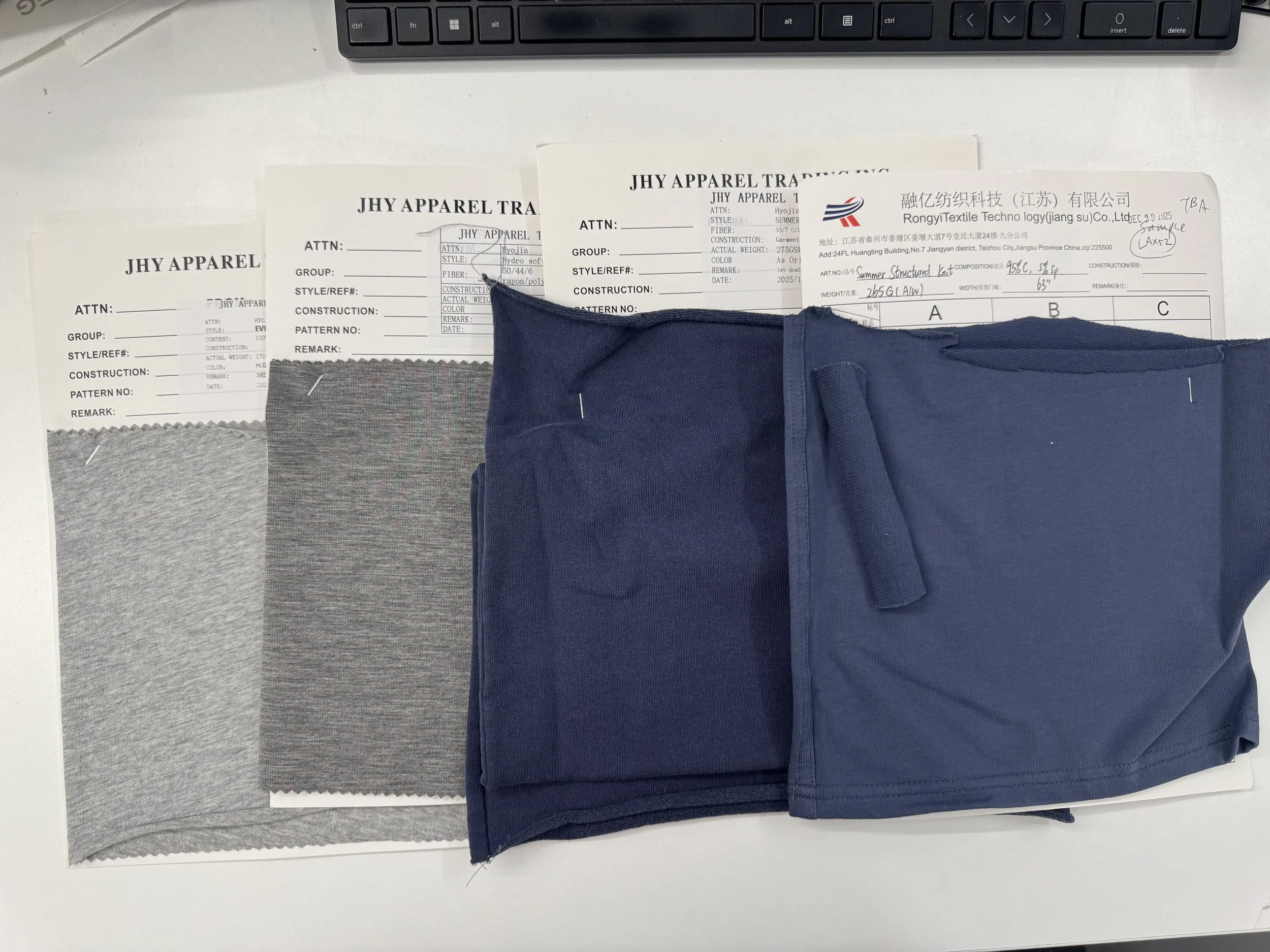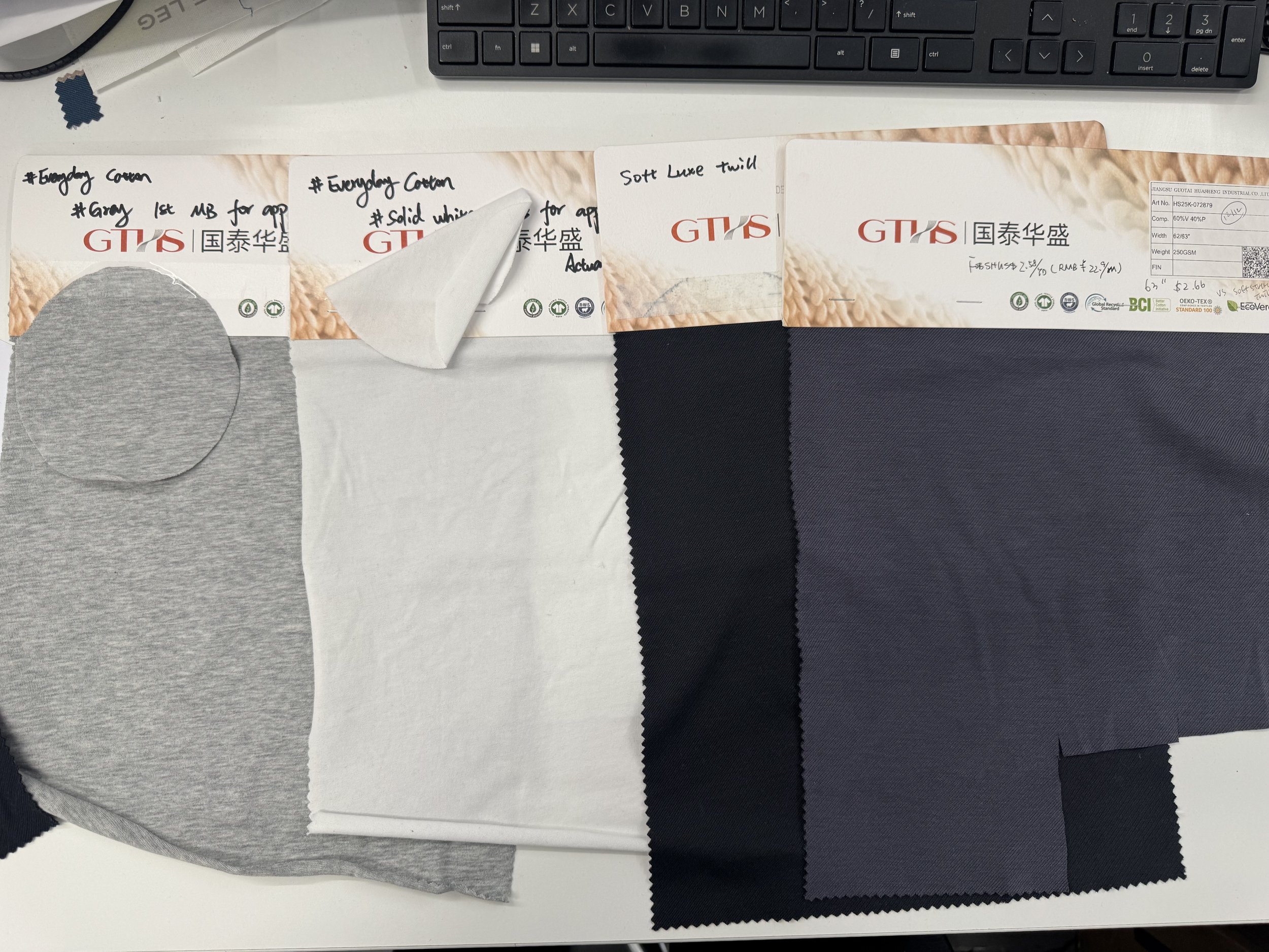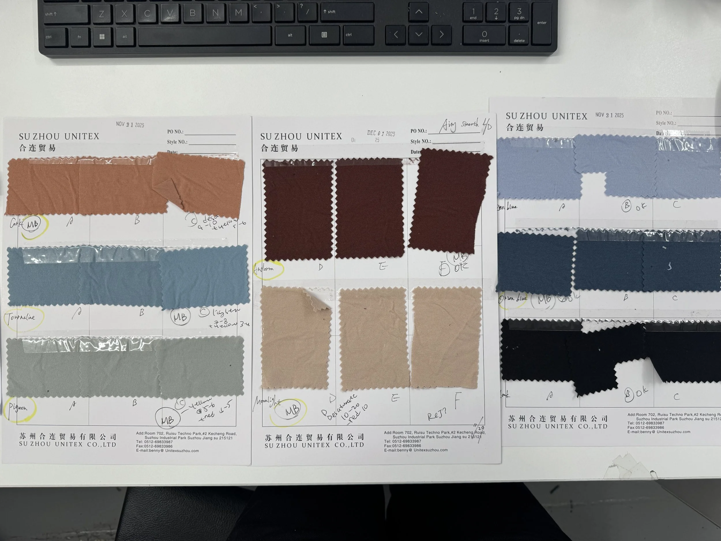 Finalized fabrics were cut into swatches and continuously updated into CAD layouts, with detailed documentation including pricing, factory information, fabric content, and washing methods for development and reference