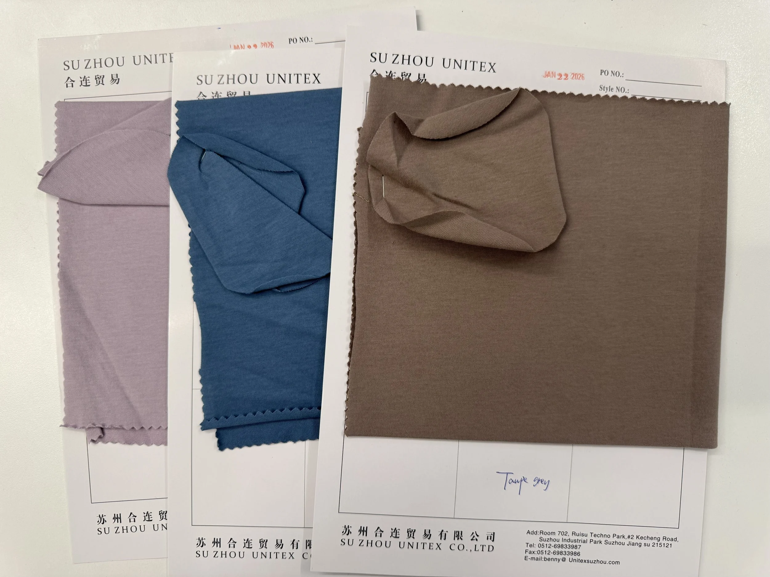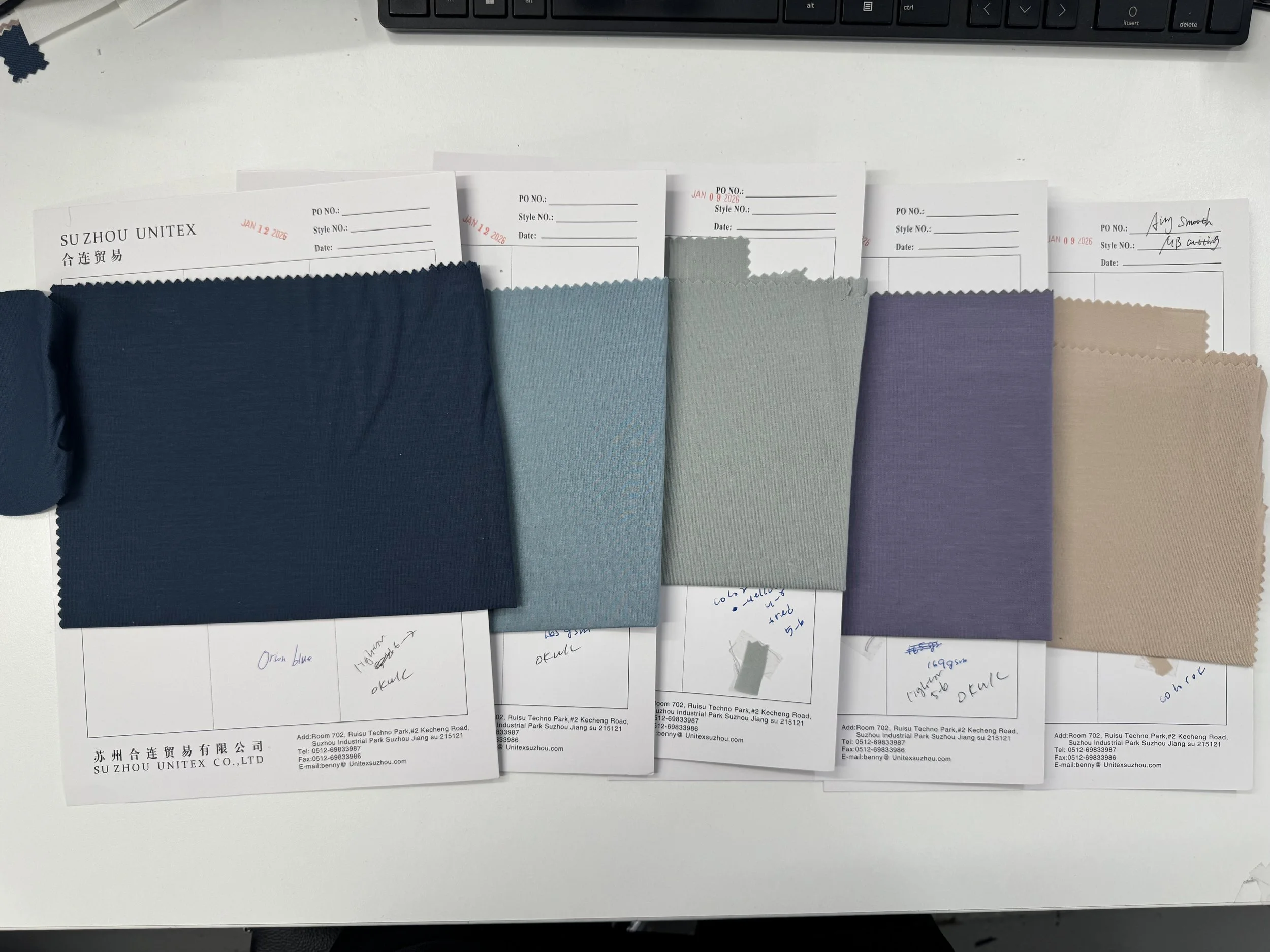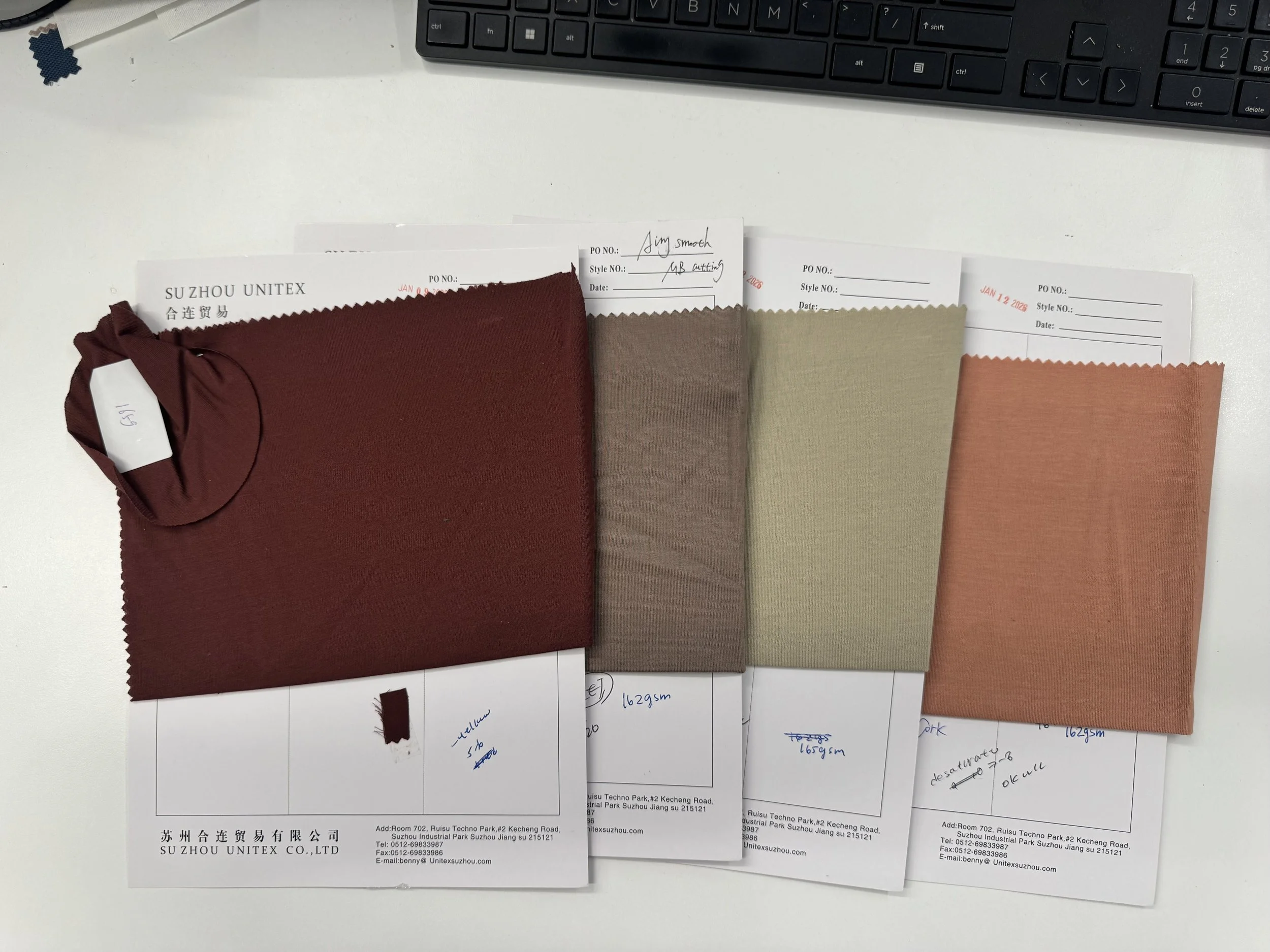 Finalized fabrics were cut into swatches and continuously updated into CAD layouts, with detailed documentation including pricing, factory information, fabric content, and washing methods for development and reference
