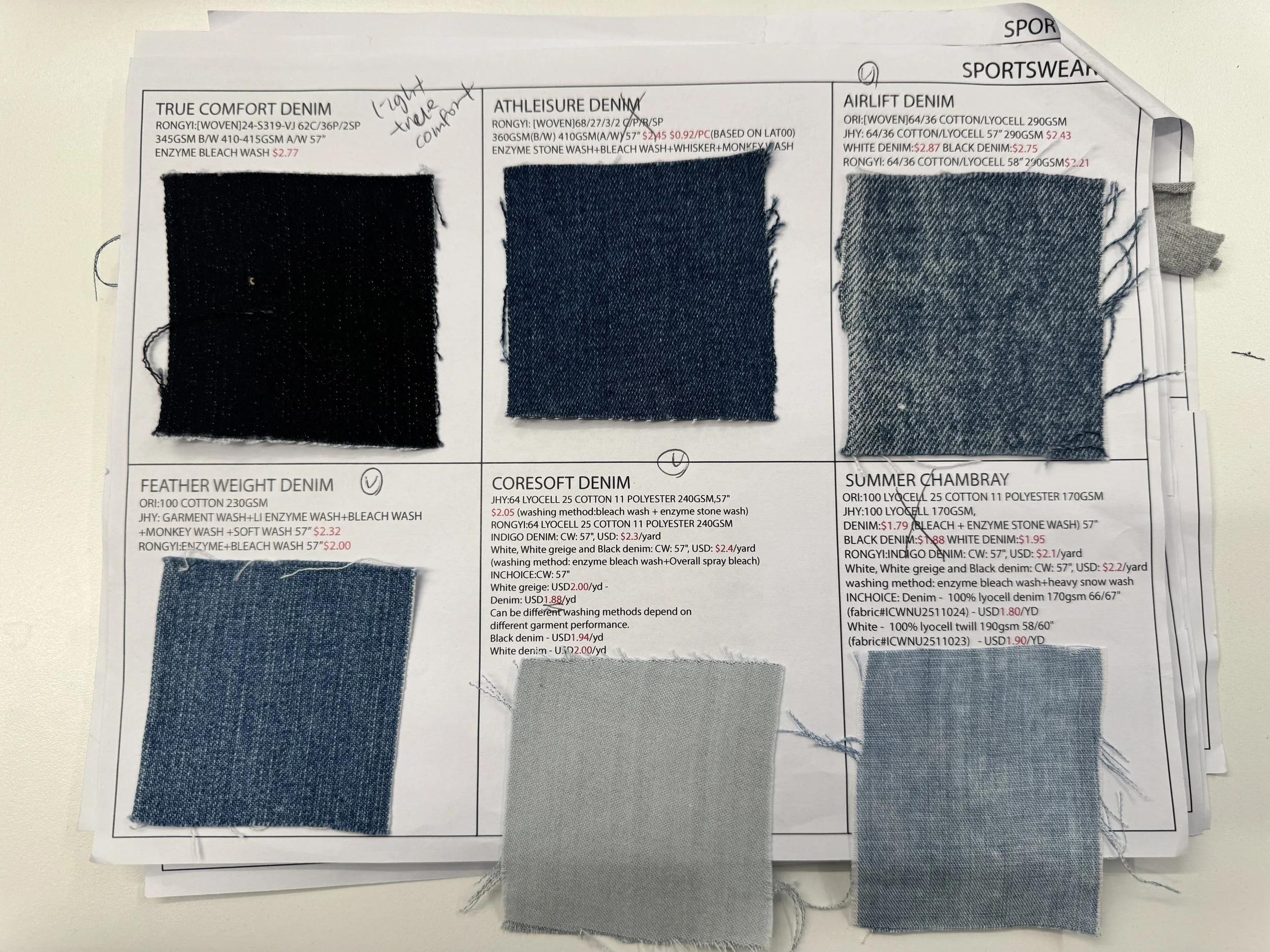 Finalized fabrics were cut into swatches and continuously updated into CAD layouts, with detailed documentation including pricing, factory information, fabric content, and washing methods for development and reference